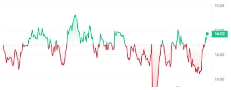 截至最新数据,Aptos 交易价格为 14.76 美元,近 24 小时上涨 0.76%。它保持着 0.24% 的市场主导地位,并且在过去一年中价格飙升了 17%。此外,Aptos 的交易价格比 200 日简单移动平均线 (SMA) 高 108.67%,其中性相对强弱指数 (RSI) 为 68.53。此外,Aptos 表现出良好的流动性,其成交量与市值比率为 0.3570。