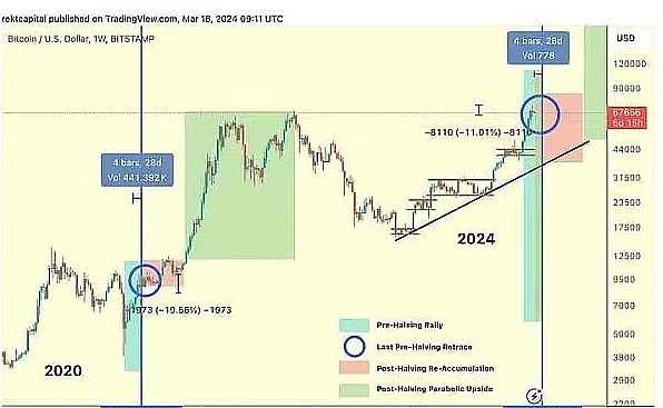 在比特币减半前约60 天,都会发生减半前反弹走势。本轮减半前也出现了反弹,而且比预期的还要早几天。目前,比特币正从减半前反弹阶段过渡到减半前回调阶段。