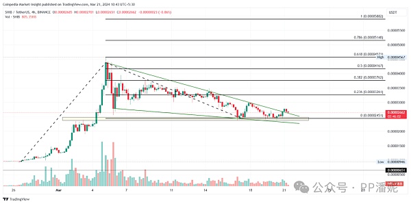 随着最近Meme币需求的增长,与0.000024美元形成的双底模式相一致,市场价格飙升。这种飙升导致了看涨突破,并超越了上方趋势线。