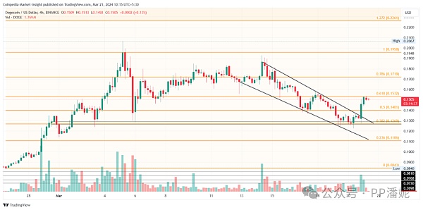 在4小时K线图中,DOGE价格展现出下降通道,但随着买家的回归,未能维持下降趋势。随着看涨突破,狗狗币价格正在挑战61.80%的斐波那契水平,预示着牛市可能会突破该水平。