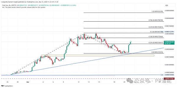 FLOKI的价格在一夜之间大幅上涨了31%,形成了一根巨大的看涨吞没蜡烛。今天的上升趋势仍在持续,盘中涨幅为6.63%,准备突破0.00025美元的重要关口。