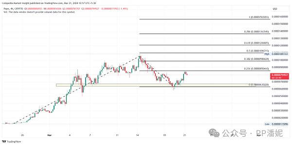 在4小时图表上,PEPE价格展现出了顶级表现者水平的大规模牛市。从2月16日到3月14日,这种模因币暴涨了超过800%,最终出现了轻微回调。