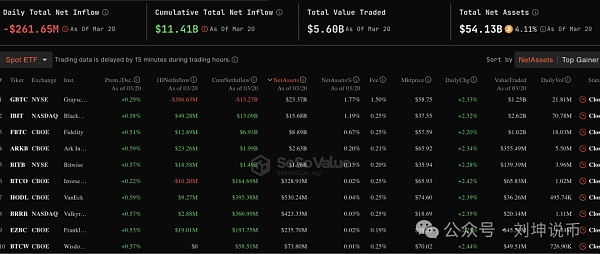 根据SoSoValue的数据,ETF 交易量持续下降 ,所有ETF 的净流入 额为 -2.6165 亿美元。截至 3 月 20 日,除了自 ETF 推出以来资金流出规模最大的 Grayscale 之外,BTCO 是唯一出现亏损的其他产品,亏损额为 1020 万美元。