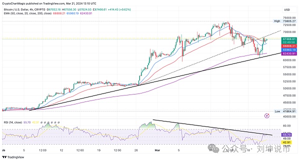 如果出现新一轮下跌,潜在的支撑区域包括位于 65,940 美元的 20 日均线、目前位于 62,430 美元的 200 日均线以及连续趋势线。