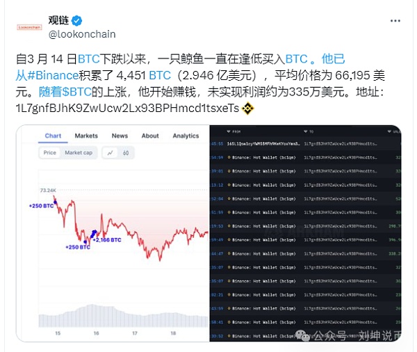 一些鲸鱼也开始疯狂购买。例如,区块链交易跟踪公司 Lookonchain 强调,一位投资者“自 3 月 14 日 BTC 下跌以来一直在逢低买入 BTC”。