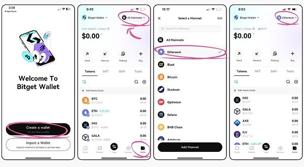 3.创建后,导航到“钱包”页面,从右上角的主网列表中添加“以太坊”。4.您已成功为以太坊创建了Web3钱包!现在,您可以通过“代币管理”将以太坊上流行的游戏币,如GALA、IMX、PRIME、AXS和ILV添加到您的钱包中。