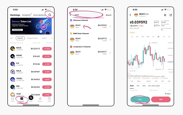 5.要从这里购买任何游戏代币,请点击“市场”并搜索您喜欢的游戏代币。选择“购买”以访问Bitget Swap并开始交易!
