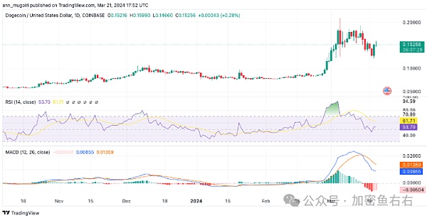 随着DOGE关注关键阻力位,势头增强最近几个交易日,狗狗币在0.12美元到0.16美元之间浮动,跌幅为9%。尽管如此,过去一个月它的价值增长了89%,使人印象深刻,也反映了其他基于meme的加密货币的类似上涨走势。这一走势体现了投资者的浓厚兴趣,暗示在不久的将来势头将持续。