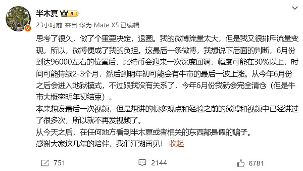 半木夏急流勇退,流量太大确实不是好事。到了做减法的阶段,有必要做一些舍弃。半木夏今天宣布退圈了,这一轮已翻50多倍,预估接近百亿身价了。上一轮牛市就已近上亿级别。依稀记得,半木夏起步的时候还是靠套网贷,如今已经成神了。