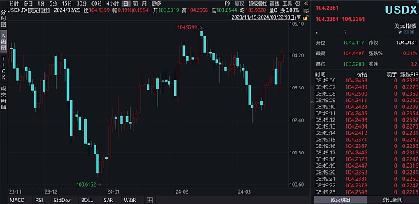 据观察,美元指数近日持续上升,已从3月8日开盘的102.81,上涨至目前的104.42,今日开盘后一路上升。