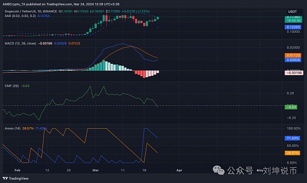 构成其抛物线转向指标的虚线位于其价格上方,证实了 DOGE 价格面临看跌压力。