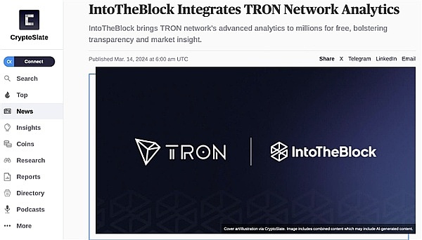 海外重要行业媒体:知名服务商IntoTheBlock现已集成波场TRON网络分析数据