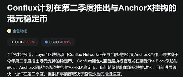 根据多家媒体的报道,CFX正与香港金融公司Anchorx合作,计划于今年第二季度推出港元稳定币。这一稳定币将由Anchorx发行,并在CFX生态链上进行流通。这一合作预示着CFX将迎来资金流量、交易量和活跃度的巨大增长,从而极大提升其公链的价值。