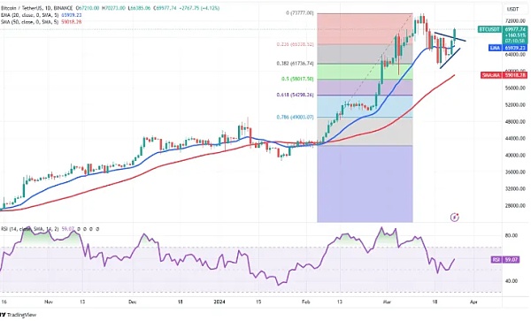 谈到价格,BTC继续收于 69,000 美元上方。这反映出多头有兴趣测试 73.777 美元。如果像几个月来那样继续以“一退二进”的方式上涨,那么目标是 80,000 美元。