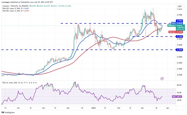 如果价格从上方阻力位回落,则表明空头继续将缓解反弹视为卖出机会。ADA/USDT 货币对可能会再次跌至 0.57 美元。如果该支撑位被打破,该货币对将完成看跌的头肩形态。