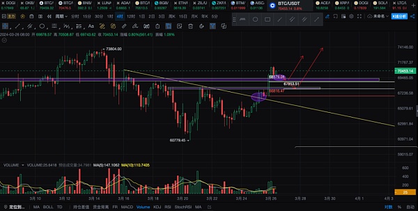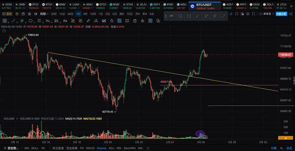 BTC昨晚直接对7万美金形成了突破,我们所关注的压力区间直接破了,那么回调基本可以说是结束,恭喜上车的伙伴,这一波行情如果抓住那能够获取的利润不亚于一波趋势。