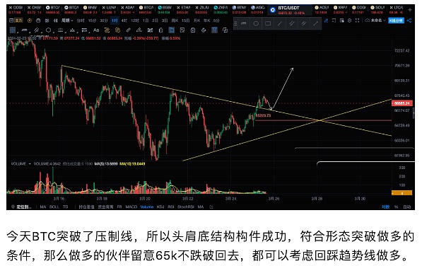 那么压力区间直接突破,所以高位还是能够追涨,后续68.8k。67.8k都可以考虑做多,可以分批建仓,止损按照我们一般方式的设置66.8k附近做止损。