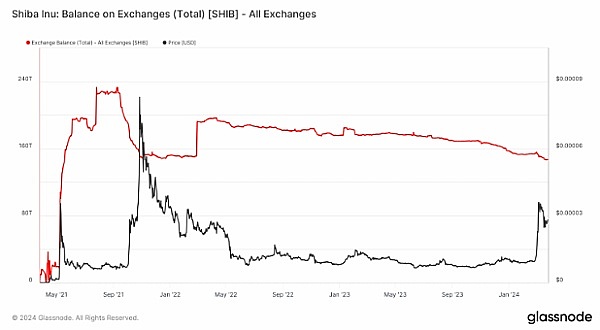 根据Glassnode 的数据,加密货币交易所持有的柴犬 [SHIB]总量已降至 2022 年 3 月以来的最低水平。