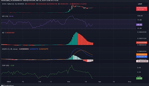SHIB 的移动平均收敛分歧 (MACD) 指标的读数显示,该代币的 MACD 线在 3 月 14 日穿过其信号线下方,证实了看跌趋势。