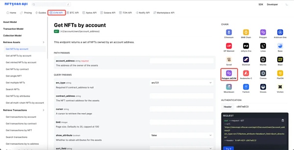 目前,NFTScan 开发者平台也已经同步上线了 Polygon zkEVM 网络的 NFT API 数据服务,目前对外开放了多个 API 查询接口,满足各种业务场景下对 Polygon zkEVM 链上 NFT 数据的索引需求。如果你是 NFT 和 Web3 领域的开发者,欢迎使用 NFTScan 开发者平台提供的 Polygon zkEVM 网络的 NFT API 数据服务,低门槛的快速在 Polygon zkEVM 网络上构建产品和协议。