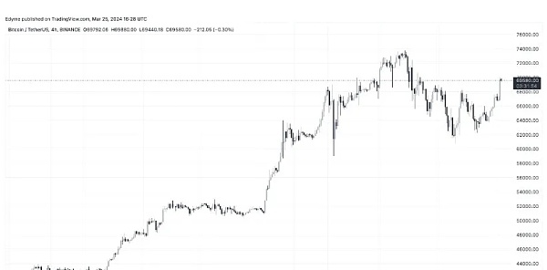 考虑到周一凌晨比特币的价格低于66,000美元,突然上涨至超过69,000美元尤为引人关注。虽然这次突然上涨的确切原因尚不确定,但它使得比特币的价值距离恢复到历史高点73,000美元仅差几美元。