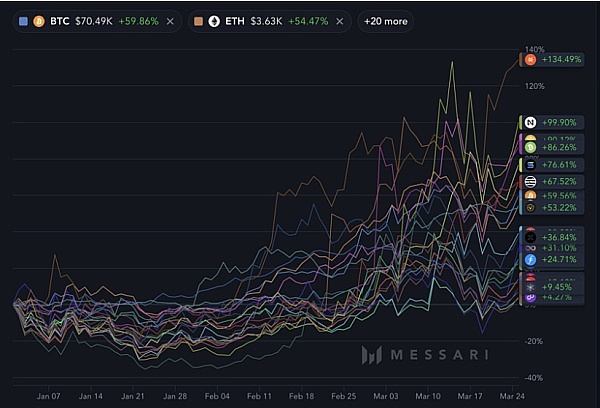 与市值排名前 21 的代币(不包括稳定币和模因币)相比,Stacks 占据主导地位。 它的表现明显优于 NEAR (99%)、BNB (90%)、SOL (76%),甚至 BTC (59%)。
