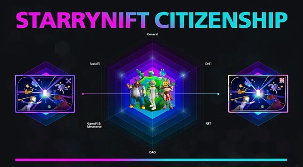 作为一款元宇宙产品,用户在场景中丰富的行为、经历和数据是构建用户Web3身份的关键组成部分。因此,StarryNift开发了数字公民DID去中心化身份协议—Citizenship,该协议整合了用户的Web2和Web3数据,包括链上和链下数据,以创建全面的用户档案。其中包含了各种维度的数据,如DeFi、SocialFi、GameFi & Metaverse、NFT和DAO等。