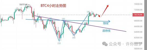 这个位置的重点在于:BTC 突破前高的时间和力度,如果48小时内价格触及新高,或是个币率先出现暴力大阳线,会有一定的抛压,可以适当高抛低吸倒差价!如果先往下,颈线和前期的趋势线附近支撑。大盘依然在准备突破新高蓄力,向上突破是大概率, 千万不要空仓(多搞山寨)。短期支撑位68978,中线支撑区间参考颈线67836。