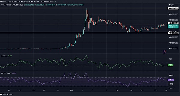 此外,RSI(相对强度指数)也有所下降,表明SHIB正在慢慢远离超买区域。