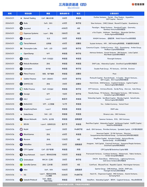 本周的融资项目涵盖了多个赛道,包括CeFi(解决方案、资产管理)、DEX、zk、隐私、社交、应用链、LSD、NFT、DeFi(衍生品、流支付、借贷)、游戏、元宇宙、钱包、帐户抽象、人工智能、DePIN、云计算、Layer2、比特币生态、模块化区块链、BRC20(工具)、Layer1等领域。