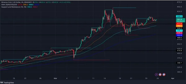 尽管比特币价格波动导致图表不稳定,但由于短期移动平均线超过长期移动平均线,这给 BNB 币发出了看涨信号。如果BNB币多头能够保持强劲,价格可能会继续逐步上涨。在这种情况下,主要阻力位将是历史高点之前的 645 美元。