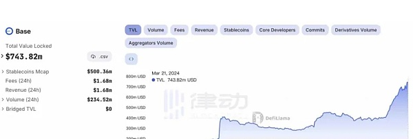 在没有发币预期的情况下,Base成为了以太坊 Layer 2 中的一个独特存在。在Base上,似乎每隔一段时间就会出现一些非常成功的项目,为整个生态带来了实实在在的收入和流量。通过观察TVL(总锁定价值)的走势图,我们可以看到,自Base上线以来,已经经历了三次大幅上涨的情况。