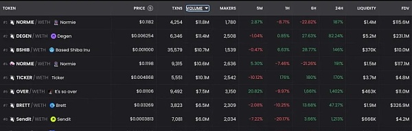 在成交热度方面,过去24小时的成交额达到了4.43亿美元,而且主要集中在Meme代币和Farcaster生态代币DEGEN上。随着资金流入到Base生态系统,Base上的成交额也在不断急剧增加。