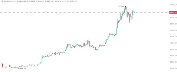 目前关注的位在74000点前期的高点附近,有效支撑位在66000。虽然这个位置不会被跌破,但是考虑到目前的价格过高,一旦插针的时候一定要预防这个位置。