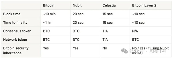 值得注意的是,Nubit 使用 BTC 作为其共识协议的主要代币,并通过类似 Babylon 的比特币原生质押机制来继承比特币的经济安全性。与之相反,诸如 Celestia 等通用 DA 层使用其网络代币,在引入了比特币之外的额外信任假设。
