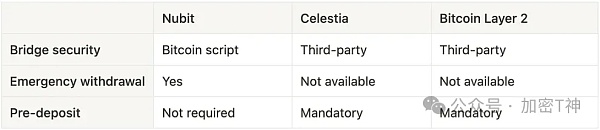 Nubit 与其他 BTC 桥解决方案的一个关键区别在于其使用比特币支付通道进行网络费用结算。与其他方案不同,Nubit 用户无需承担预存款的要求。相反,他们可以直接在每笔交易的状态通道内处理交易费用,从而确保用户资金的安全与比特币本身的安全直接相关。此外,Nubit 的设计还允许紧急取款,即使 Nubit 停止运营,用户也可以通过关闭比特币支付通道来收回资金。