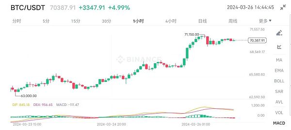 在上周比特币现货ETF资金外流的不利消息后,比特币投资者在周一已经恢复了信心,比特币价格再次攀升至70000美元以上。大多数数字资产价格也呈现上涨趋势,比特币价格更是突破了71000美元/枚,日内涨幅达到7.34%。这是比特币价格一周多以来首次突破70000美元大关。同时,以太坊价格上涨约6%,而Solana和Dogecoin的价格也均上涨超过4%。