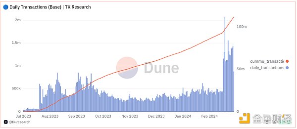 一旦 Dencun 硬分叉激活,将 Rollup 设置为使用它引入的 Blob 会便宜 100 倍。Base rollup的使用量立即飙升: