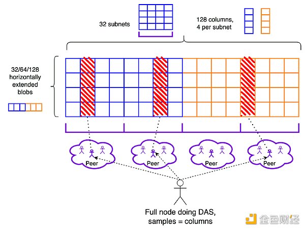 下一阶段可能是 DAS 的简化版本,称为PeerDAS。在 PeerDAS 中,每个节点存储所有 Blob 数据的很大一部分(例如 1/8),并且节点维护与 p2p 网络中许多对等点的连接。当节点需要对特定数据片段进行采样时,它会询问它知道负责存储该数据片段的对等体之一。