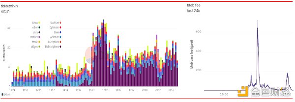 右:blob 费用因此“进入价格发现模式”。来源: https: //dune.com/0xRob/blobs