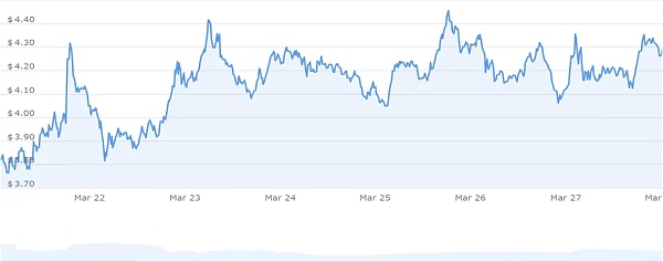 在 Coinbase 上市的消息发布后,Ronin 稳步上涨,在 30 个交易日中有 17 个交易日出现绿色烛台。仅在过去 7 天里,Ron 就上涨了 10.40%,交易价格为 4.21 美元。但是,在过去的盘中交易中,RON 下跌了 1.01%,交易量减少了 5.20%,至 56,646,085 美元。然而,罗宁的情绪仍然看涨,表明反弹。