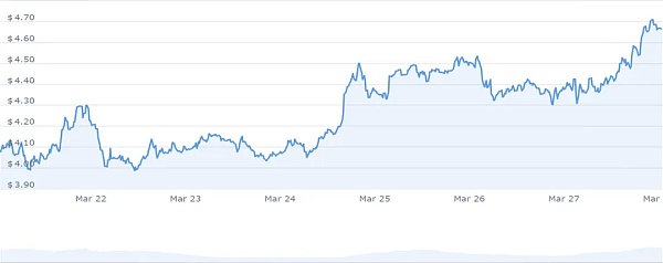 PancakeSwap 在 BNB 链上占据主导地位,截至 3 月 26 日的交易额超过 13 亿美元。CAKE在过去三天一直呈上升趋势,从4.1美元上涨至4.66美元。该代币盘中上涨 6.02% 后价格为 4.67 美元。与此同时,CAKE 的市场情绪依然看涨,Greed 核心为 80。