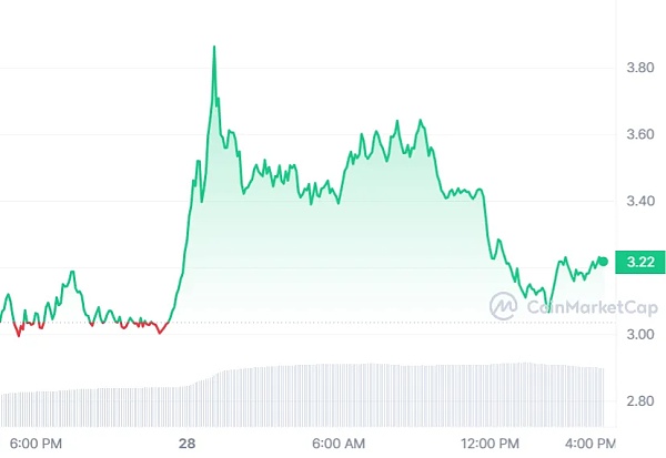 截至撰写本文时,AEVO 的市值超过 3.5 亿美元,股价约为 3.3 美元。自推出以来,其整体表现基本上呈抛物线形,短暂下跌使其价格跌至 2.01 美元,然后转入上升趋势。在过去24小时内,