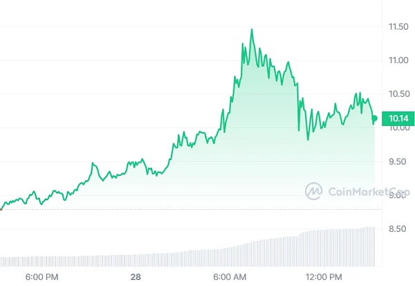 其价格涨幅超过10%,交易量增长超过100%。由于 AEVO 的市场交易量是当前价格的两倍以上,价格进一步上涨的可能性很高,特别是在投资者认为流动性很高的情况下。