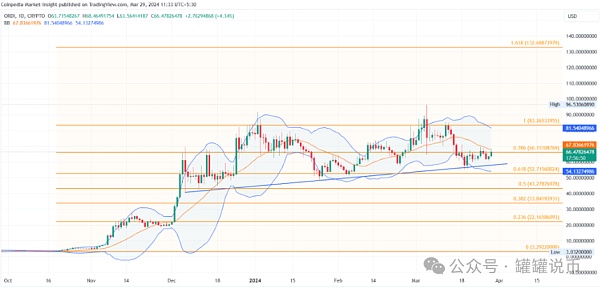 随着近期的反转,ORDI 价格挑战 78.60% 斐波那契水平,并准备再次测试 85 美元。考虑到 85 美元的巨大供应量以及盘整期间盘旋势头的强度,一场壮观的突破性反弹是可能的。