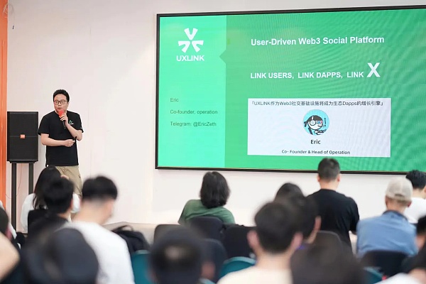 有关Web3社交赛道的基础设施,UXLINK联合创始人Eric分享了主题为《UXLINK作为Web3社交基础设施将成为生态Dapps的增长引擎》演讲。