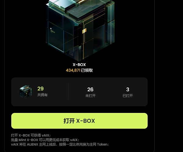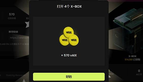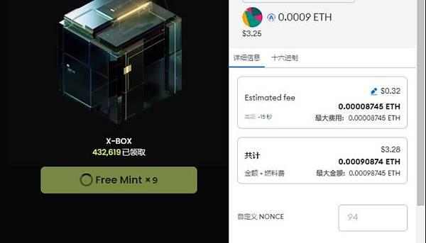 2、点右侧的Free Mint,会随机抽取1-9个箱子,抽完之后钱包会弹出支付框,我们确认支付即可获得vAIX奖励,另外每300个地址还有较小概率获得0.01ETH的奖励。支付金额主要由打开箱子的费用以及gas费组成,gas费我们忽略不计,箱子数量越多,支付的费用越高,一般打开一个箱子大概为0.35u左右。