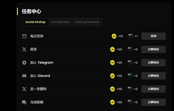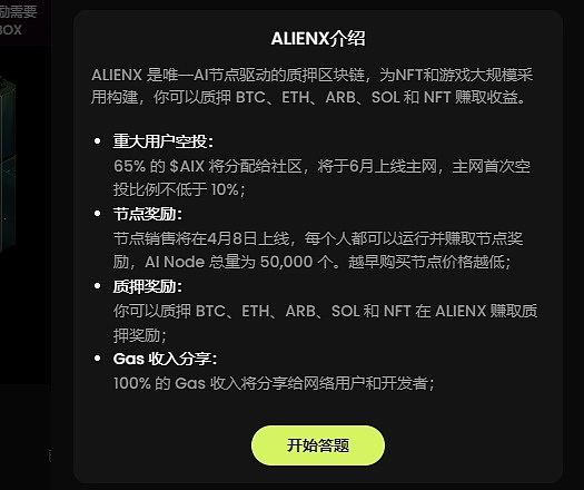 ALIENX 将Gas Fee分配给节点运行者、DApp开发者以及生态用户,真正遵循区块链的中心化主旨。将收益按照贡献分配给社区,从社区启动并回馈参与者。AI节点主要用来驱动NFT以及区块链游戏,并作为基础成为网络不可或缺的一部分,同时也将自动监控ALIENX网络,避免了可能出现的错误区块所引发的网络问题,维护区块链网络的稳定和安全。AI Node如何改变区块链ALIENX的AI Node主要通过遍布全球的AI节点利用人工智能技术自动参与对区块链网络的监测和维护,这样做的好处是可以有效增强网络的整体安全性,同时网络的性能也更加具有伸缩性和智能化,并根据实时情况做出改变。区块链节点的运行和维护并不是节点程序正常运行后就一劳永逸,而是需要运维人员时刻关注节点状态,比如虚假的区块被提出、节点掉线、无法出块导致大规模断网等故障以及网络拥堵等问题都在一些市面上知名公链比如Solana、Polygon等都出现过相应案例。以往的解决方案往往反应慢,并且影响链上DApp的运行,比如DeFi借贷或DEX交易以及链游等,为用户造成不便和可能的资产损失。ALIENX的AI Node的主要优势是通过AI第一时间进行问题预警并通过备用方案进行接管,比如当网络出现不正确的出块提议或故障拥堵等,AI Node将发起通讯,验证节点此时可以快速介入,以便维护网络的正常运行,确保用户能够正常使用。在这里AI Node被设计成通过AI 代理的方式运行,并成为维护网络运行的关键因素。AI Node是开放给普通社区用户来参与的,每个人都可以购买AI Node和参与节点运行,并获得丰厚的节点奖励,官方表示会有40%的代AIX代币被分配给AI Node的运行者,以激发用户的参与热情。社区激励活动ALIENX 在今年公布了项目的一系列社区激励活动,代币总量的65%将用于社区激励的分配。社区用户通过参与项目交互、社交任务、AI节点等方式可以获得代币奖励!