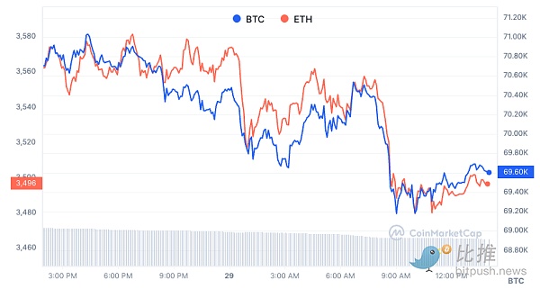 鲍威尔讲话后,加密市场迅速回撤,比特币跌破 70,000 美元,以太坊跌破 3,500 美元,SOL 和ADA下跌 1%,而比特币现金 (BCH) 上涨 4%,延续了周四的涨势。