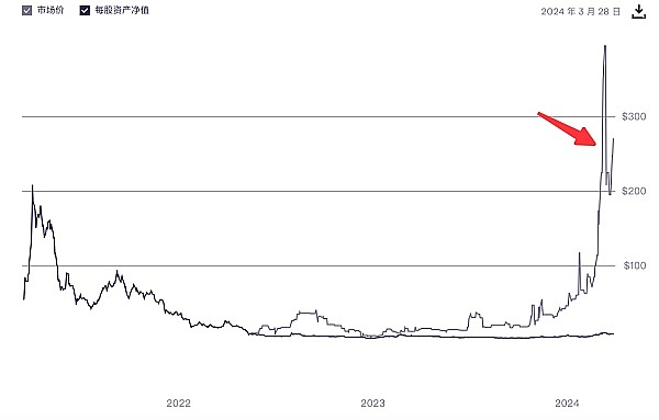 对于灰度基金FIL这个信托产品来说,它也挺神奇的,因为它的溢价一直是最高的。最近的溢价更是超过30倍,每股净资产只有9美元左右,但是二级市场交易却高达约250美元。